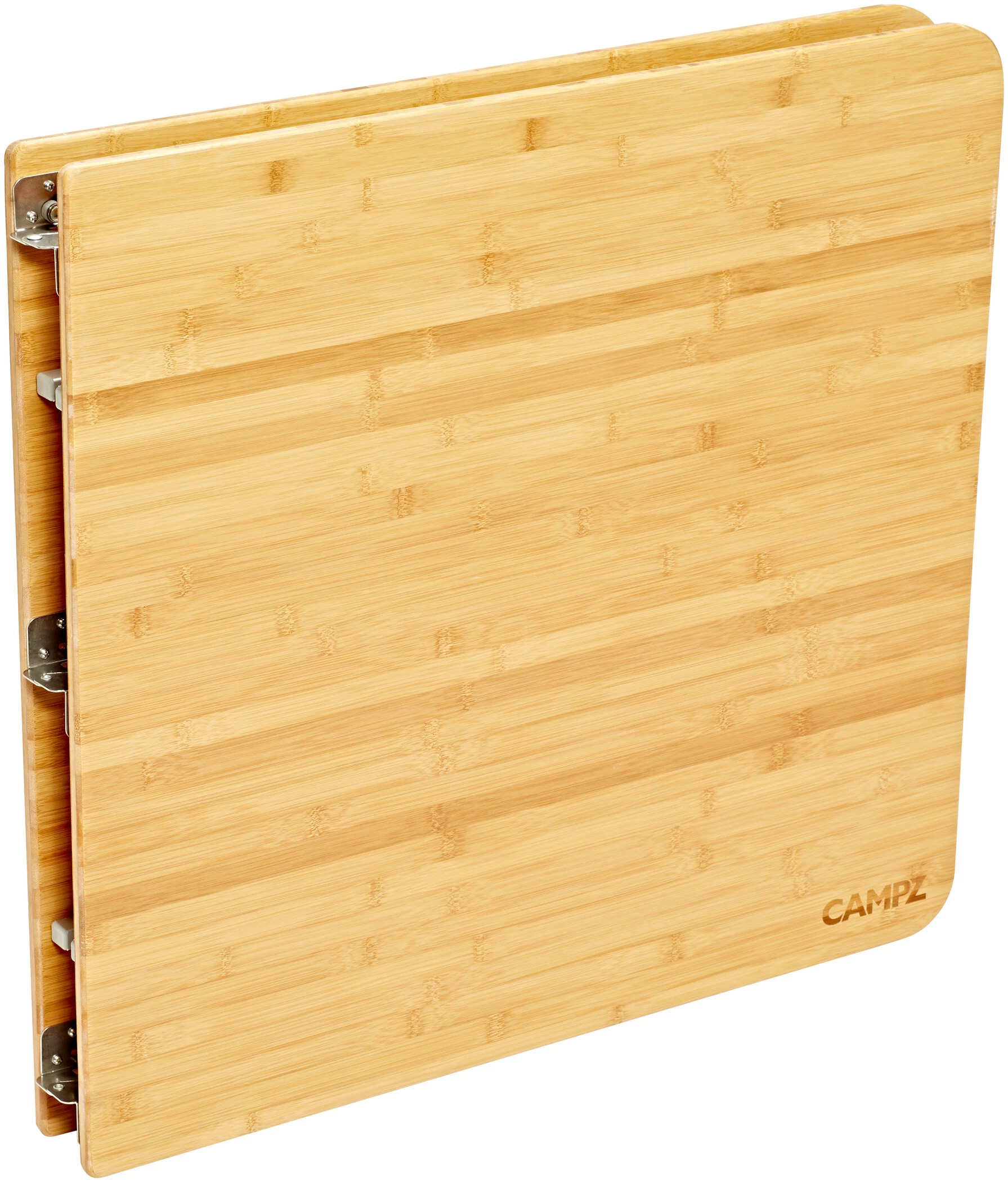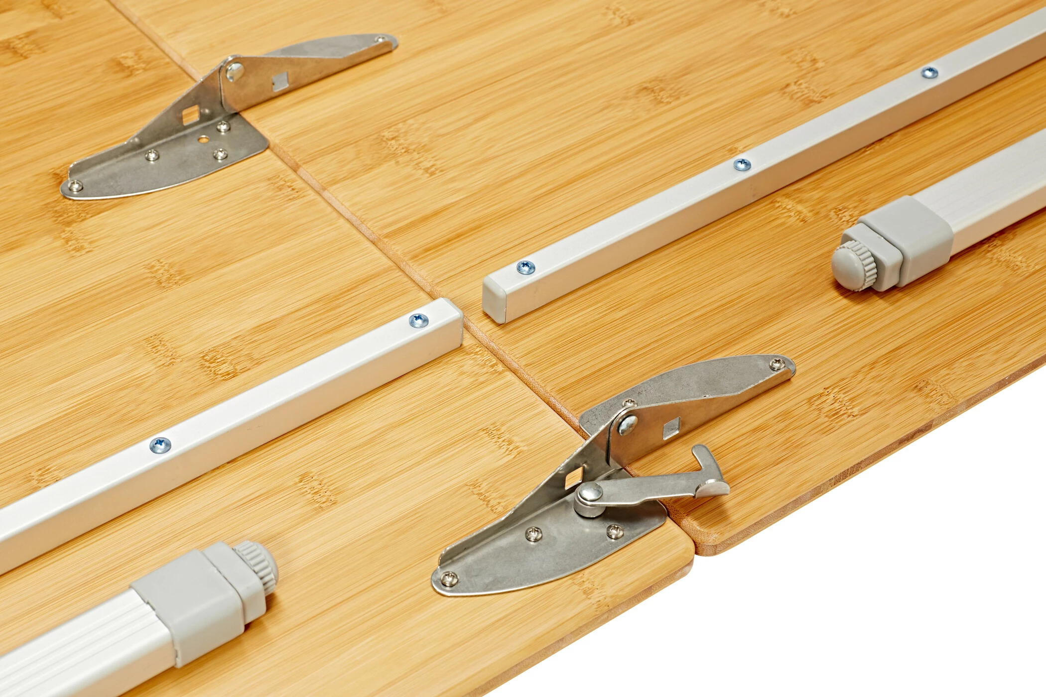 Deze edele CAMPZ bamboe tafel is een blikvanger op elke camping, balkon of tuin. De tafelpoten kunnen op 3 hoogtes worden vergrendeld: op 49,5, 58,5 en 70 cm. Het tafelblad kan in het midden worden opgevouwen en worden opgeborgen in de bijgeleverde pakzak. Ook de aluminium stangen zijn bijzonder licht.