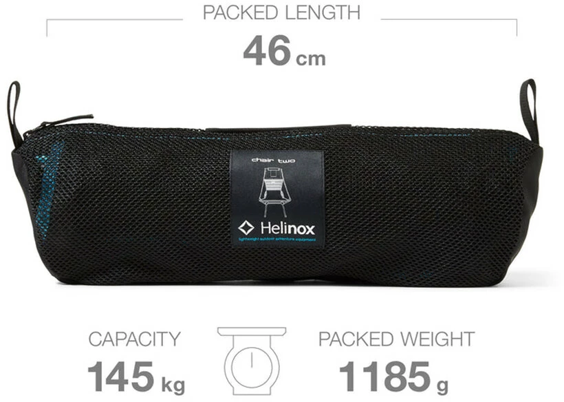 De Helinox Chair Two is een extra lichte, opvouwbare campingstoel met een hoge rugleuning voor extra comfort de hele dag door. Hij heeft een hoge rugleuning voor extra steun, een verstelbare hoofdsteun en zijvakken voor smartphone, snacks en zonnebril. Hij weegt ongeveer evenveel als een fles wijn en is kleiner verpakt dan een brood. Robuust en licht – het hart van het innovatieve ontwerp is een frame van een speciale DAC-aluminiumlegering met een superieure stabiliteit in verhouding tot het gewicht en een draagvermogen tot 145 kg.